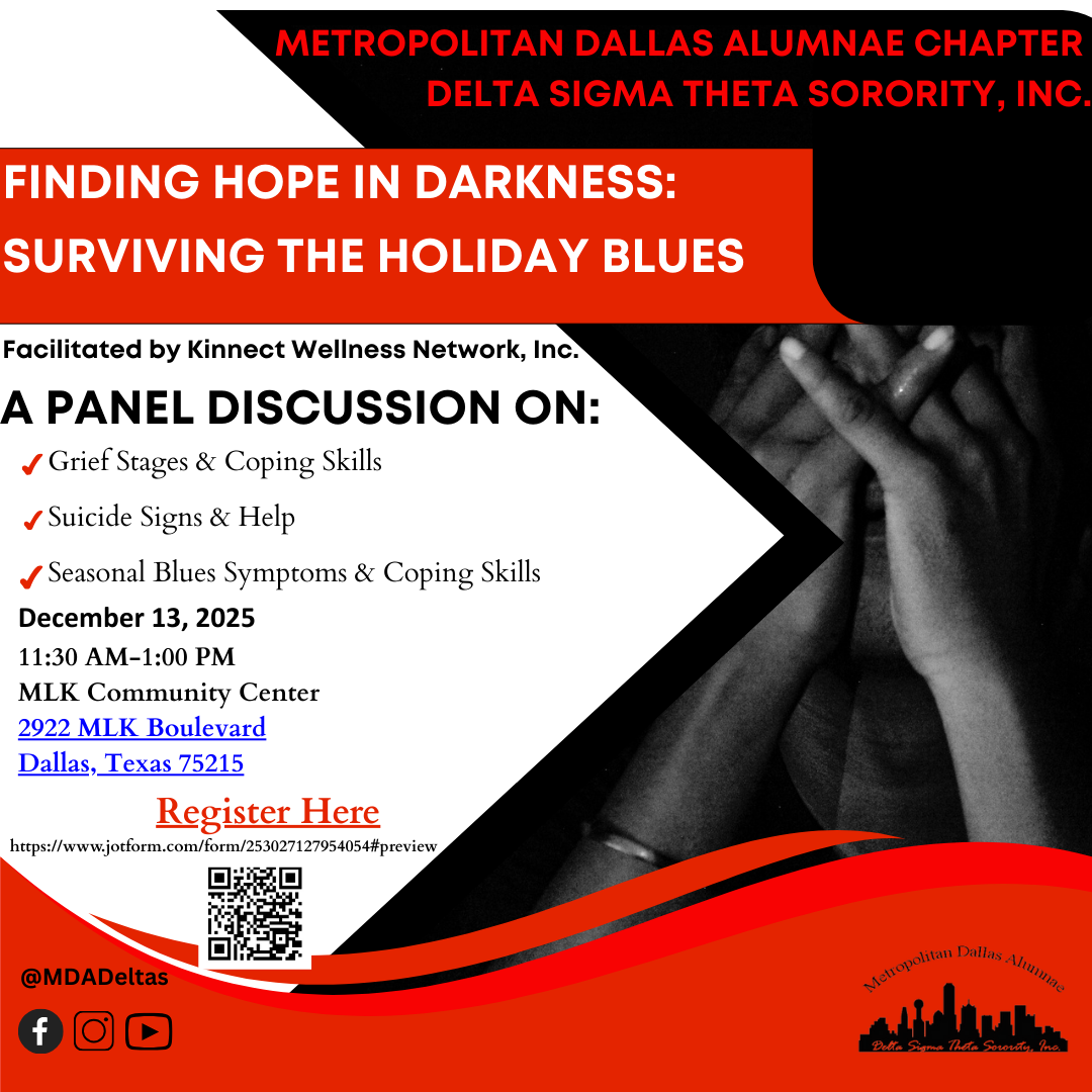 December 13, 2025 @ 11:30 am - 1:00 pm Finding Hope in Darkness: Surviving the Holiday Blues MLK Center 2922 Martin Luther King Jr Blvd,, Dallas